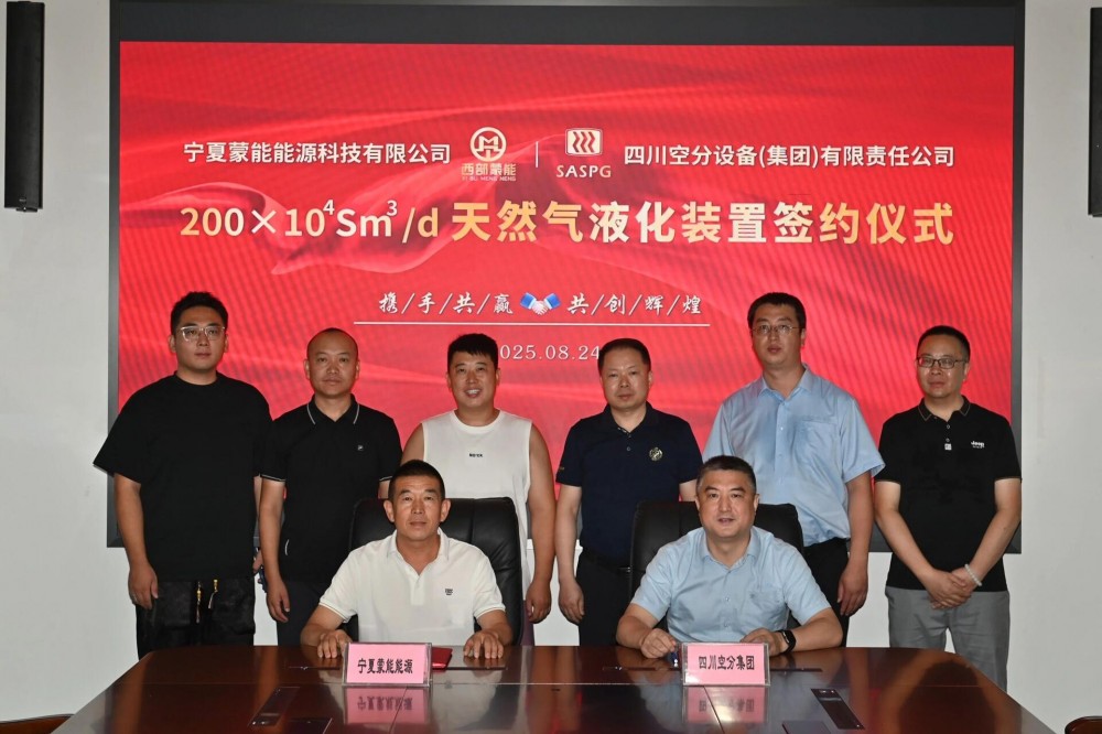 2025年8月24日,在四川空分集团总部,四川空分集团工程有限公司与宁夏蒙能能源科技有限公司圆满签署200×10⁴Sm³/d天然气液化装置合同。四川空分集团总经理计晓亮与宁夏蒙能能源科技有限公司董事长李生茂代表双方签订合同,工程公司销售副总经理许家琛、宁夏蒙能能源科技有限公司总经理李智禄和总工程师王维忠等嘉宾共同出席并见证签约仪式。