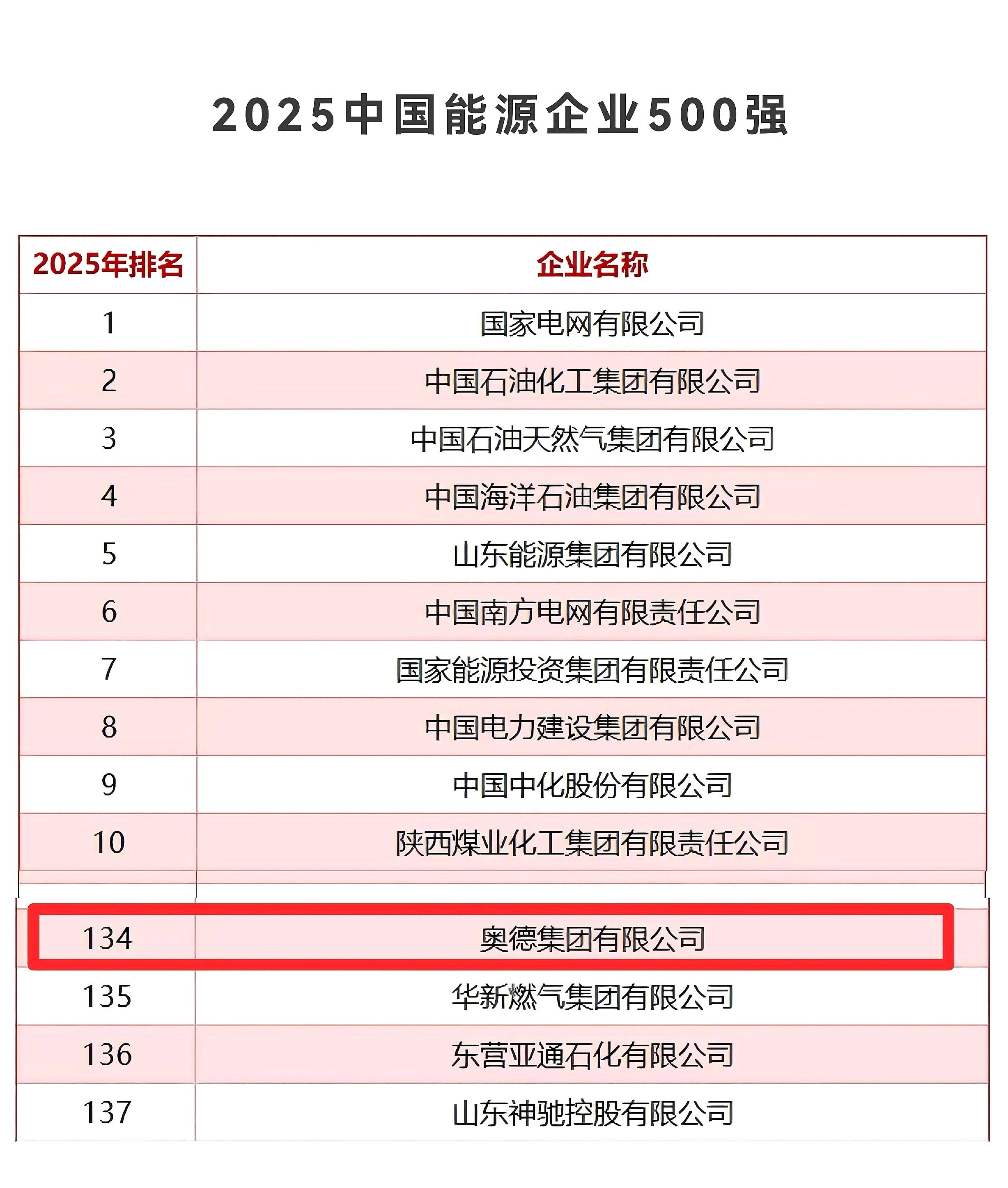 12月4日,由中国能源报、中国能源研究会主办的2025第八届中国能源产业发展年会在北京举行,发布了《2025中国能源企业500强发展报告》,奥德集团能源板块荣登2025中国能源企业500强榜单,位列第134位。